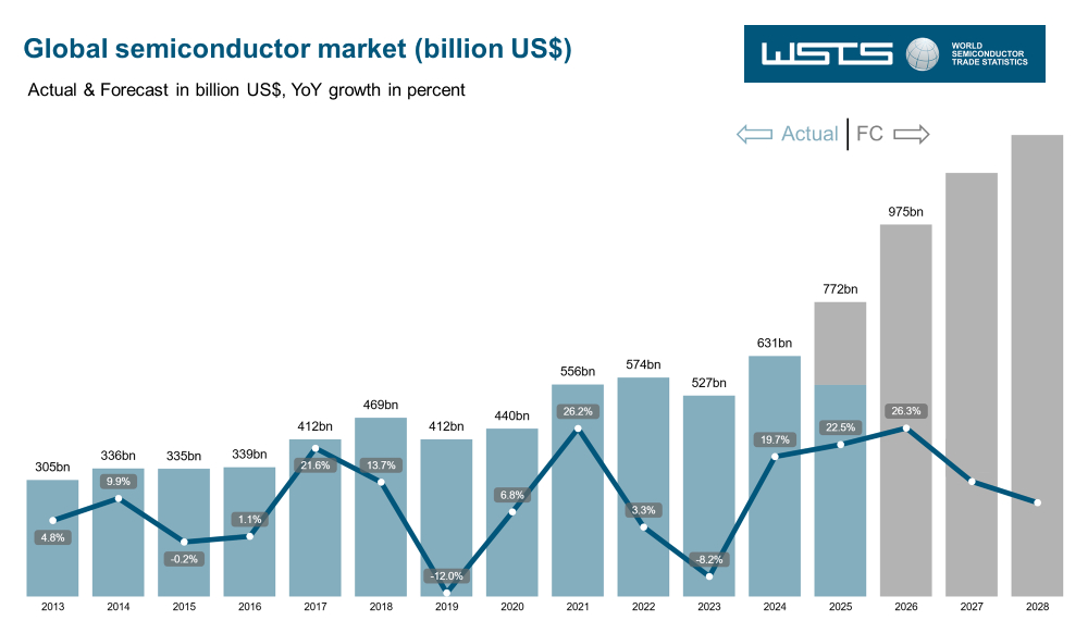 • 2026年全球半导体营收将增长26.3%,逼近1万亿美元大关